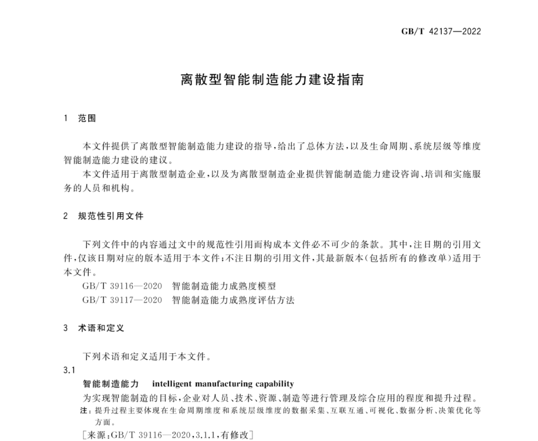 当前位置:首页 > 数转标准 GBT 42137-2022 离散型智能制造能力建设指南 时间:2025-08-16 17:28 来源:湛江市工业和信息化局 GBT 42137-2022 离散型智能制造能力建设指南