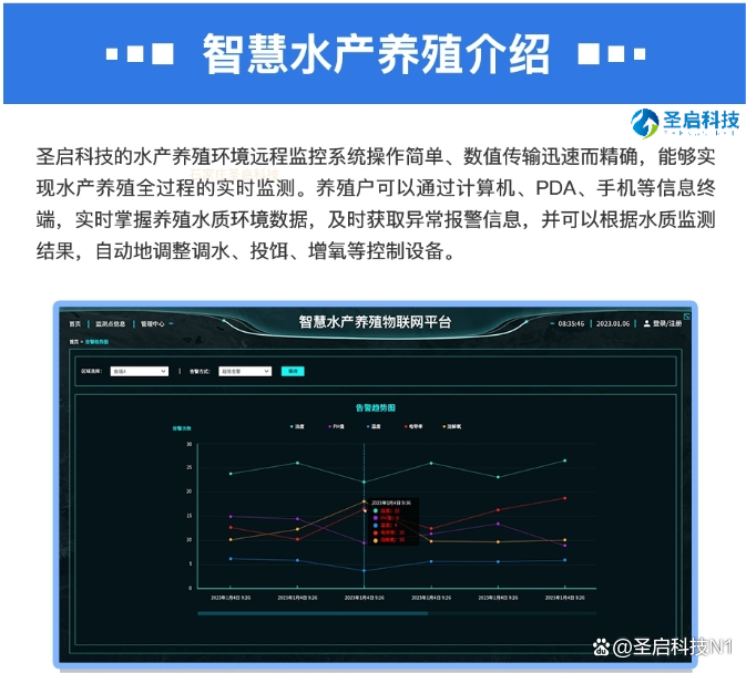 圣启科技智慧水产养殖系统是通过物联网、传感器、大数据分析等技术实现养殖环境精准调控、生产过程智能化管理的综合系统,其核心作用是提升养殖效率、降低风险、节约资源,具体体现在以下几个方面: